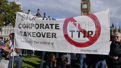 Over 1000 protested against the TTIP (Transatlantic Trade and Investment Partnership in London, Parliament Square, 11 October. The banner Save Our Democracy said it all.