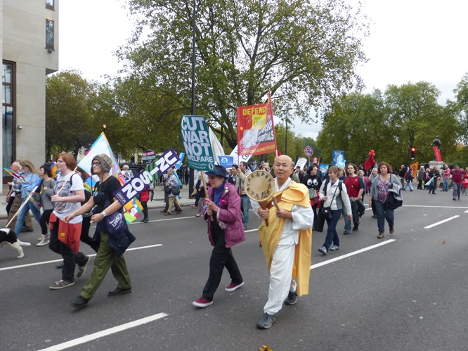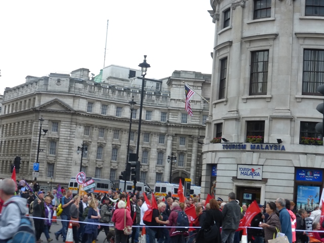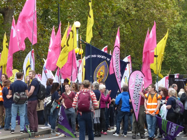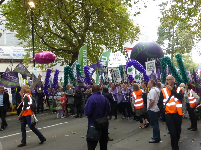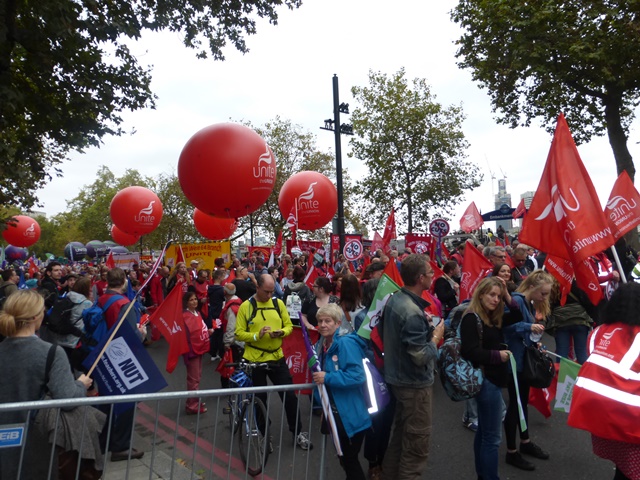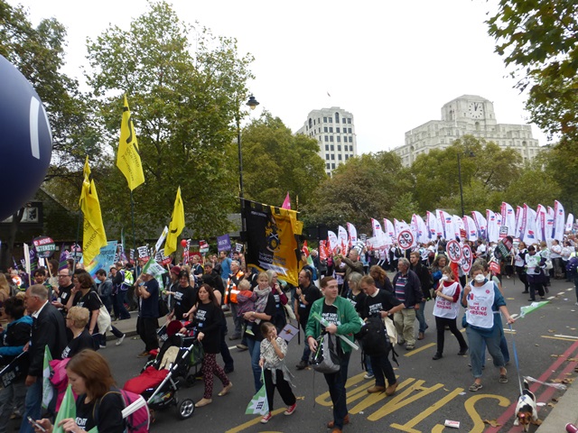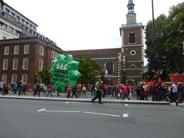 The Trade Union Congress (TUC) organised a mass demonstration in London under the banner of Britain Needs a Pay Rise., Saturday 18 October 2014. It marched through central London, culminating in a rally in Hyde Park. About 100,000 took part.