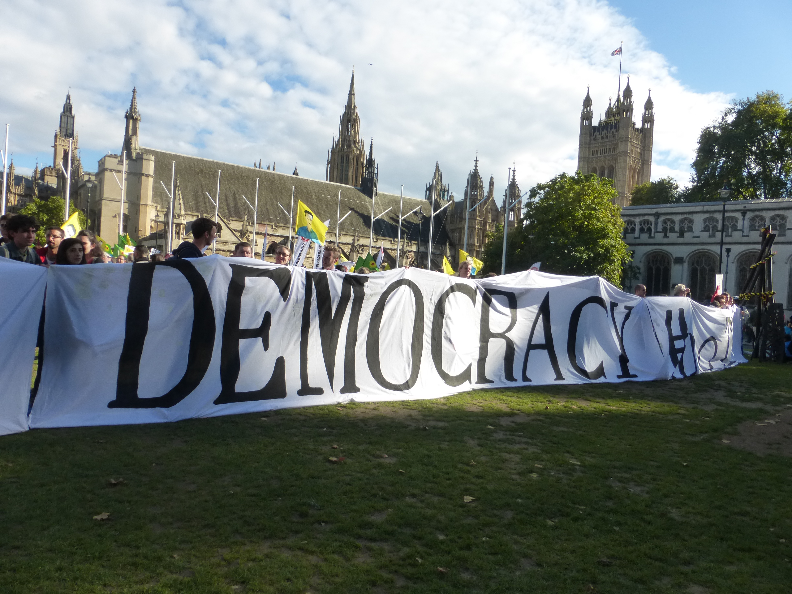 Over 1000 protested against the TTIP (Transatlantic Trade and Investment Partnership in London, Parliament Square, 11 October. The banner Save Our Democracy said it all.