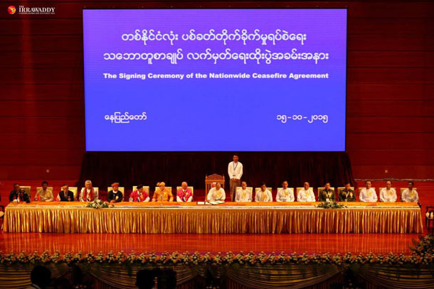 A “nationwide” ceasefire agreement was signed between the Myanmar government and eight armed groups on Thursday morning in Naypyidaw. (Photo: Hein Htet / The Irrawaddy)