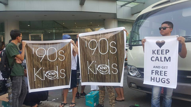 The intention of the Free Hugs campaign of the “90s’ Kids Team” is not only to promote loving kindness and make other people feel better but also to raise public awareness for their charity event “Back to Memory Lane of the 90s” to be held at “Kandawgyi Tower Island” on May 29.