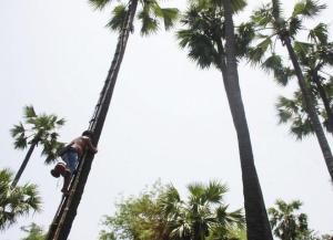 A toddy climber climbing a palm tree in Crown Prince Toddy Field. Phyo Wai Kyaw/The Myanmar Times