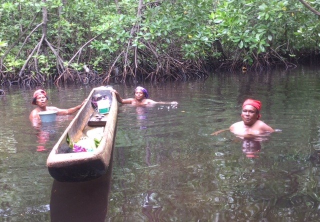Papuan women of Enggros village in Jayapura, Papua, swim in a mangrove forest, which locals call “tonotwiyat” (female forest), to collect clams in this file photo. Men are not allowed to enter the forest when women are collecting clams. (JP/Nethy Dharma Somba)