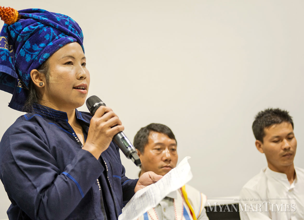 Opium farmer Daw Khin Oo speaks to the media during the Myanmar Poppy Farmers Conference. Aung Htay Hlaing/The Myanmar Times