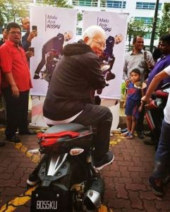 The event was staged after a casual meet-the-people session in the Malay-majority suburbia of Shah Alam, which featured a caricature of Najib of riding that same bike — a pose that he later assumed in real life.
