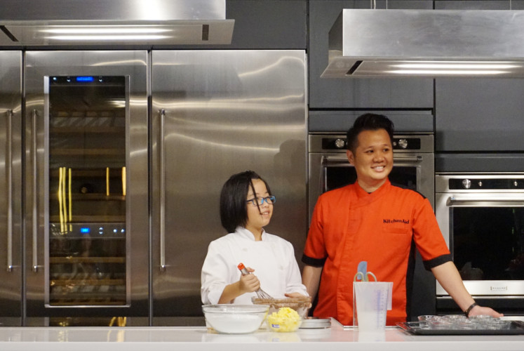 Leah Choy (left) poses with chef Ben (right) during Choi’s baking and cooking session at South Jakarta’s Gandaria City Mall on Jan. 26. (JP/Ni Nyoman Wira)