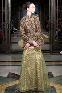 Nila Baharuddin’s Jewel of Sriwijaya Kingdom showcased pink, brown and blue couture dresses with Jacobean ruff accent and puff sleeves. The South Sumatra-born designer reminisced in the glorious era of the Sriwijaya Kingdom through accessories and jewelry from Palembang, South Sumatra.