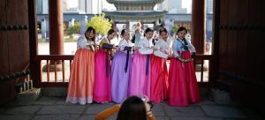 Tourists wearing Korean traditional costumes, known as Hanbok, pose for photographs at the Gyeongbok Palace in central Seoul, South Korea, in October 2016. / Reuters