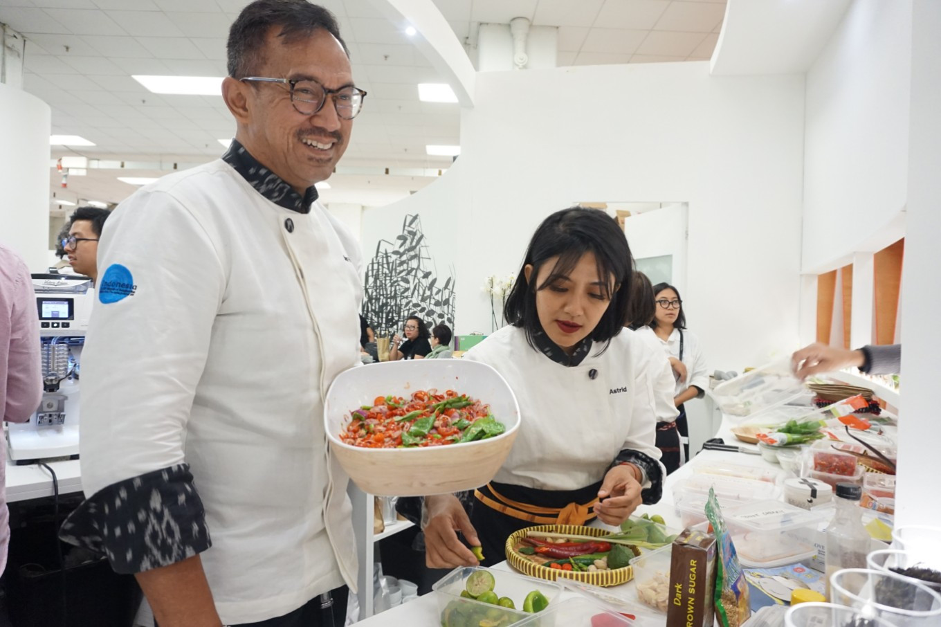 Chef Bara Pattiradjawane shows a dish of ‘sambal colo-colo’ from Maluku. Chef Astrid Enricka Dhita assists him in making the paste.