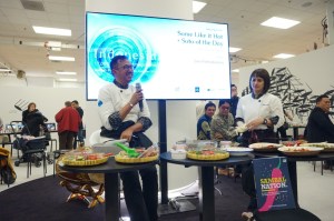 Chef Bara Pattiradjawane speaks at a panel during the third day of the 2019 London Book Fair. Culinary expert Santhi Serad helps prepare the ingredients.