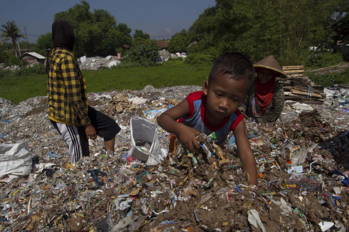 A 3-year-old boy is helping his parents sorting the waste. JP/Sigit Pamungkas