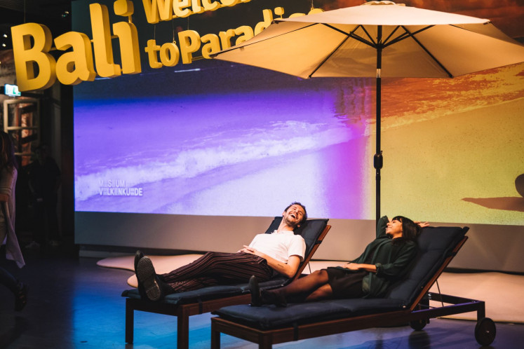 Imagining paradise: Two visitors lounge in the beach chairs displayed in the entrance hall to “Bali – Welcome to Paradise”. The exhibit runs through May 26 at the Volkenkunde Museum in Leiden, the Netherlands. (Courtesy of Museum Volkenkunde/Kirsten van Santen)