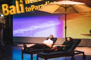 The entrance hall to the exhibition has giant screens depicting “paradise” as waves rolling onto a white sandy beach, tourists at temples and Balinese in colorful traditional dress. Two beach chairs with a parasol are arranged invitingly in the middle of the hall.