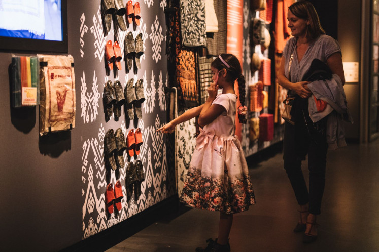 Tourist curios: Visitors look at typical Balinese souvenirs in a hallway display of the “Welcome to Paradise” exhibition at the Volkenkunde Museum in Leiden, the Netherlands. (Courtesy of Museum Volkenkunde/Kirsten van Santen)