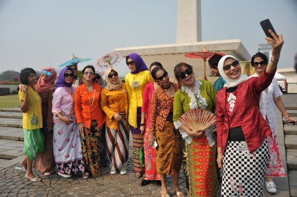 Members of Perempuan Indonesia Berkebaya community take group selfies while promoting the movement to wear the ‘kebaya’ every Tuesday at the National Monument (Monas) on Tuesday.(JP/Valerie Halim)