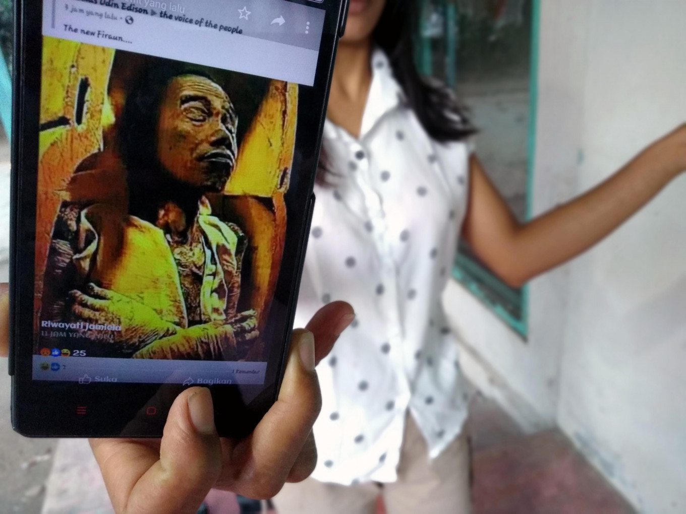 A woman holds up a mobile phone showing an image of the President doctored to resemble an Egyptian mummy, which was published on the Aida Konveksi Facebook account. (TJP/Asip Hasani )