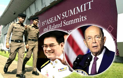 Thailand’s Commerce Minister Jurin Lasanawisit (inset) will be busy at the 35th ASEAN Summit taking place in Muang Thong Thani outside Bangkok this weekend as he juggles priorities between attempts to finalise the Regional Comprehensive Economic Partnership free trade deal and negotiations with a US delegation on trade led by US Commerce Secretary Wilbur Ross (inset) after last Friday’s bombshell from Washington when Thailand was given notice that its preferred trading status would be suspended from April 25th 2020.