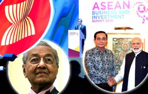 The Thai prime minister Prayut Chan ocha addressing an audience at the summit this weekend being held in Muang Thong Thani just outside Bangkok. It is understood that an announcement on the RCEP trade deal, the biggest in the world, is still in the offing as the Indian prime minister (inset right with Thai PM) comes under pressure. Meanwhile, the Prime Minister of Malaysia Mahathir Bin Mohamad (inset left) has called for ASEAN to speak with one voice and railed against US bully tactics on trade.