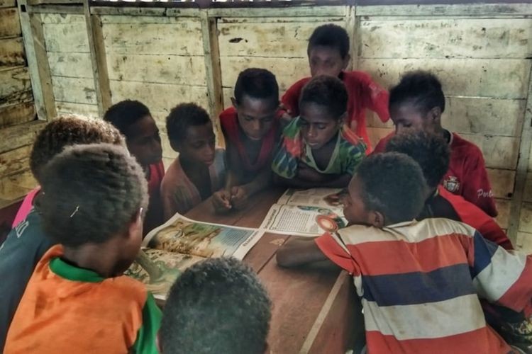 Schoolchildren gather around books in Kaibusene village, Mappi, Papua. (kompas.com/Irsul Panca Aditra)
