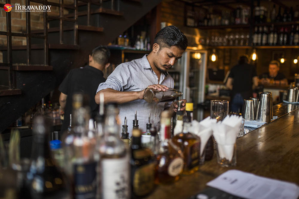 Yangon mixologist Ko Lal Muan Puia making his competition cocktail “Kalay Pop” at Gekko Yangon. / Htet Wai / The Irrawaddy