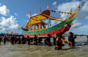 Tidung tribesmen in North Kalimantan carried a Padaw Tuju Dulung boat out to sea during the Iraw Tengkayu Festival at Amal Lama Beach in Tarakan, North Kalimantan, on Sunday. The tribal festival is held every two years to give thanks to God for his bounty.