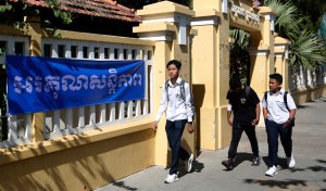 Students walk pass one of the banners at Sisowath High School. KT/Siv Channa
