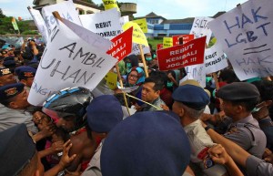 Pro-LGBT supporters scuffle with police in Yogyakarta. (Antara Photo/Andreas Fitri Atmoko)