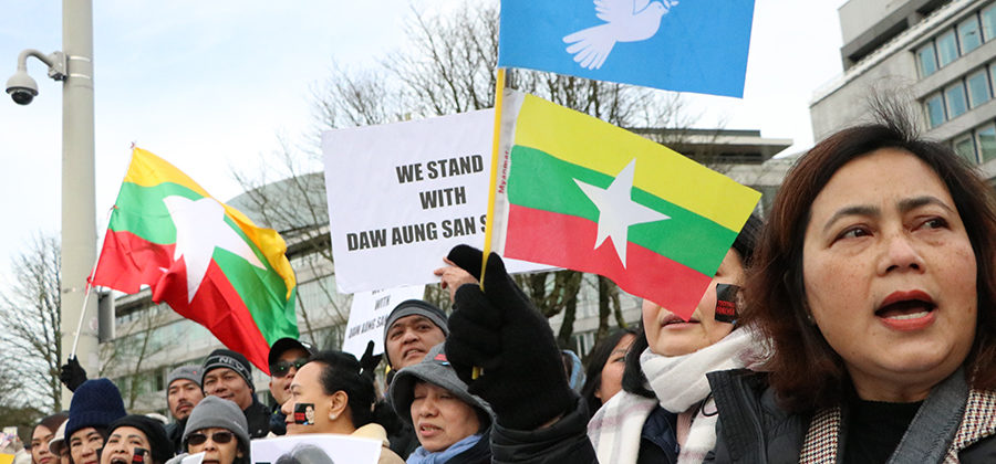 Members of the Myanmar diaspora outside the International Court of Justice in The Hague on Dec. 11, 2019. / Kyaw Phyo Tha / The Irrawaddy