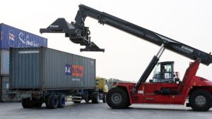 A crane vehicle lifts a container at the Phnom Penh Autonomous Port’s new terminal in Kien Svay district’s Banteay Dek commune, Kandal province. Hong Menea