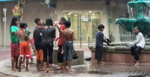 Bajau Laut children play at a water fountain on Gaya Street in Kota Kinabalu, Sabah.