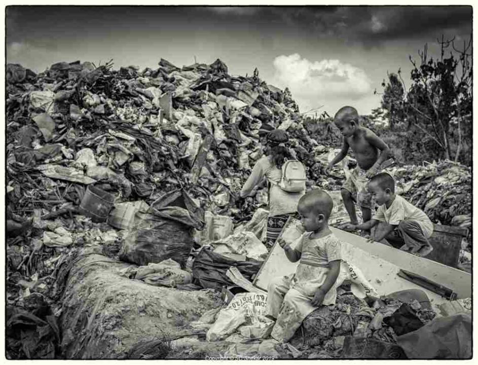 A stone’s throw away, some 15 men, women and children huddle under a makeshift shelter, oblivious of the strong stench of decaying rubbish that fills the air. They are waiting for the scorching afternoon sun to set before venturing out again into the toxic garbage to separate the recyclables which they can sell.
