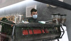 A typical day at the cafe starts with thorough disinfection. With protective masks and gloves, the baristas sprayed each other with medical alcohol and then disinfected equipment with food-grade sanitizer.