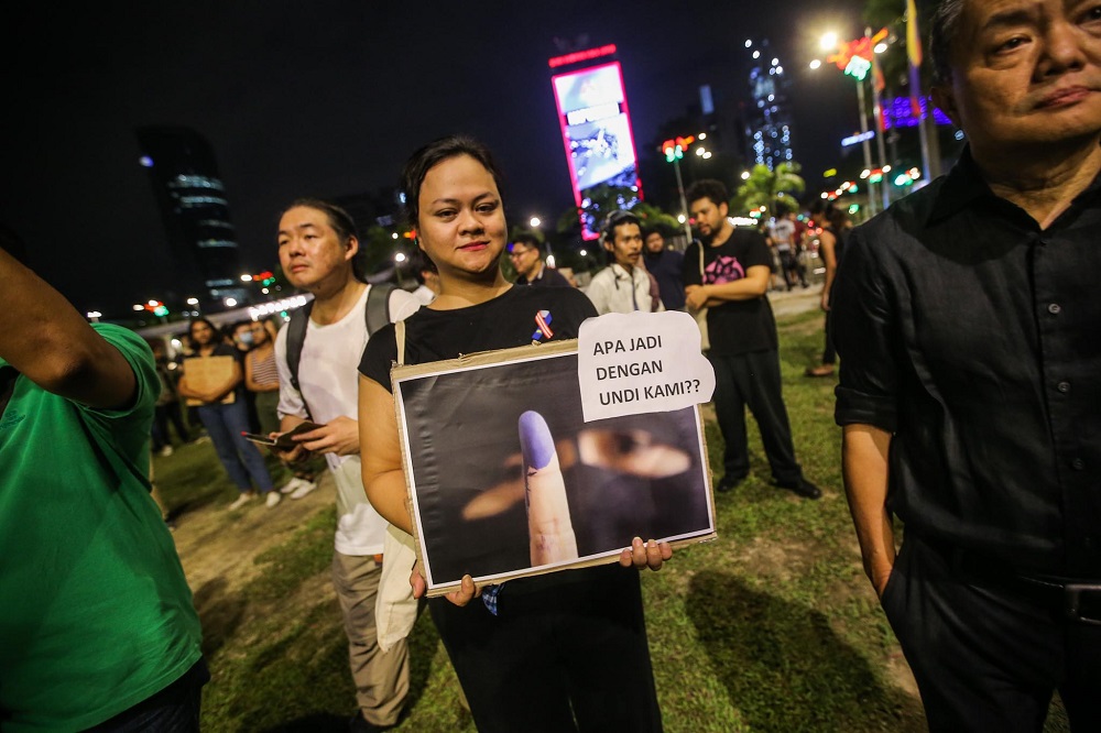 A protester is see holding a poster that reads ‘What has happened to our votes?’ during a rally at Dataran Merdeka in Kuala Lumpur February 25, 2020.