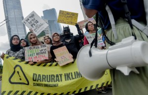 JAKARTA, Indonesia – Climate change protesters held a rally on Jalan Sudirman in Central Jakarta on Sunday to raise awareness of the climate crisis. On the same day, many parts of Jakarta went under water as heavy floods hit the capital for the second time this year.
