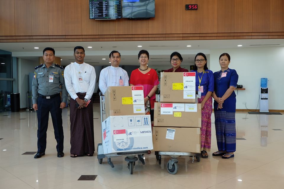 YANGON, Myanmar – The Singapore Government on Wednesday donated 3,000 diagnostic tests and two polymerase chain reaction (PCR) machines for the detection of COVID-19 in response to a request from the Myanmar Ministry of Health and Sports. Vanessa Chan, Singapore’s ambassador to Myanmar, handed over the equipment to the director of the Myanmar National Health Laboratory, Dr. Htay Htay, at Yangon International Airport. (Photo: Singapore Embassy in Yangon)