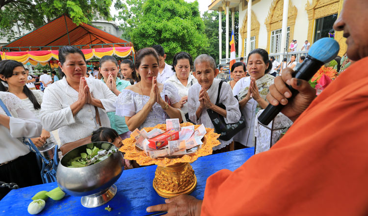 A Buddhist monk gives a blessing to Buddhists during a ceremony at the pagoda. KT/ Chor Sokunthea