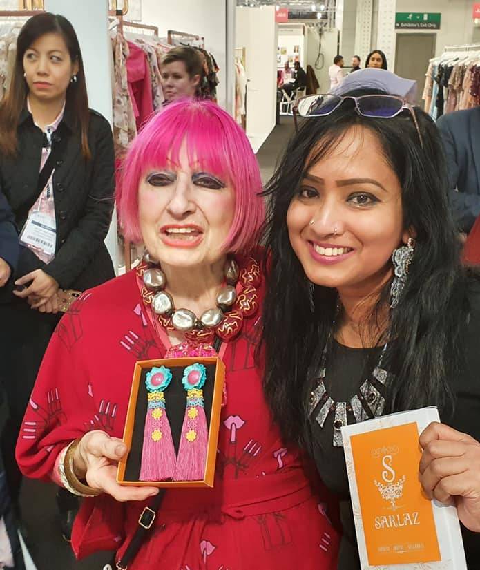 Sarla Devi posing with English fashion and textile designer Dame Zandra Rhodes at the Pure London trade event.