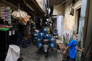 Getting through: A water seller brings empty water bottles to a water agent for refilling in Ancol, North Jakarta. Clean-water distribution is a competitive small business in slum areas in Jakarta. (JP/Jerry Adiguna)