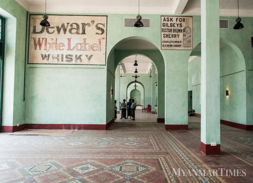 Dewar’s “White Label” Whisky and Gilbey’s Rustan Brown Sherry advertisements were discovered in-tact in the Myanmar Aswe (Burmese Favourite co.) building, years after it had been abandoned. Shin Moe Myint (J)/The Myanmar Times