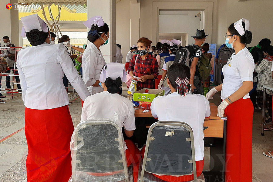 Nurses conduct health checks on people who have returned from outside the country in Naypyitaw in March. / Aung Thiha Tun / The Irrawaddy
