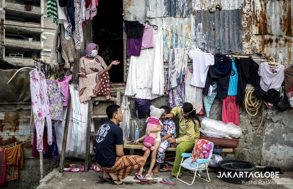 A family sunbathes together outside their home in Petamburan. (JG Photo/Yudha Baskoro)