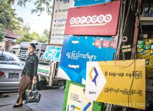 A woman walks by signs for mobile phone service providers Telenor, Ooredoo and MPT on Bogyoke Aung San road in Yangon. Photo: The Myanmar Times