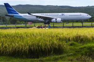 An airplane of Indonesia’s national carrier Garuda Indonesia lands on a runway beside a paddy field at Blang Bintang airport in Banda Aceh on April 2, 2019. (AFP/Chaideer Mahyuddin)