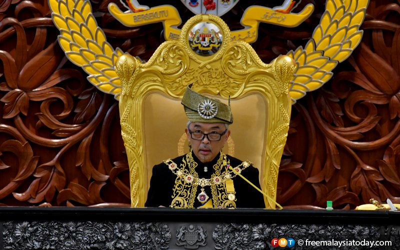 Yang di-Pertuan Agong Sultan Abdullah Sultan Ahmad Shah gives his royal address at the Dewan Rakyat today.