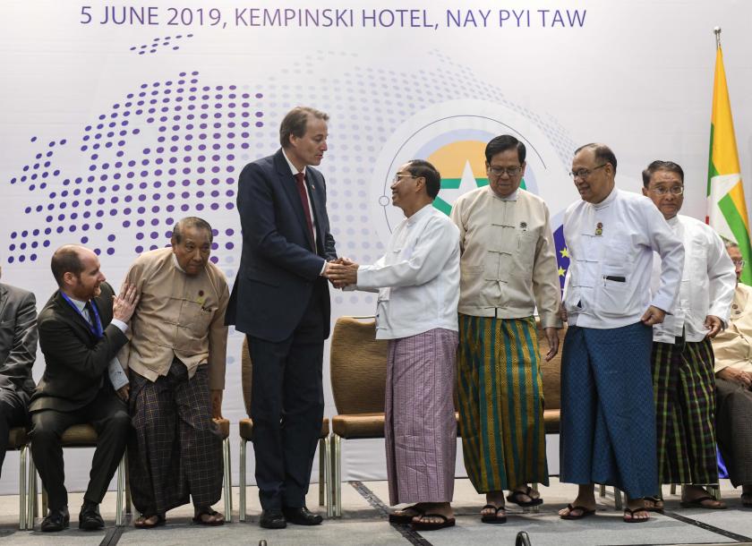 EU ambassador to Myanmar Kristian Schimdt shakes hands with Vice President U Myint Swe during the 2019 EU-Myanmar Economic Forum. Photo: Aung Htay Hlaing/ The Myanmar Times