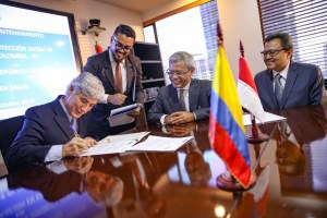 Representatives of the Colombian Health Ministry sign an memorandum of understanding on health cooperation with the Indonesian Health Ministry, represented by the Indonesian Embassy in Bogota, at the office of the Colombian Health Ministry in Bogota on October 16, 2019. (Courtesy of/Foreign Ministry/-)