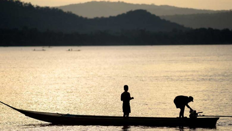 A fisherman starts his boat engine as his son looks on along the Mekong River in Luang Prabang, Laos. MRC