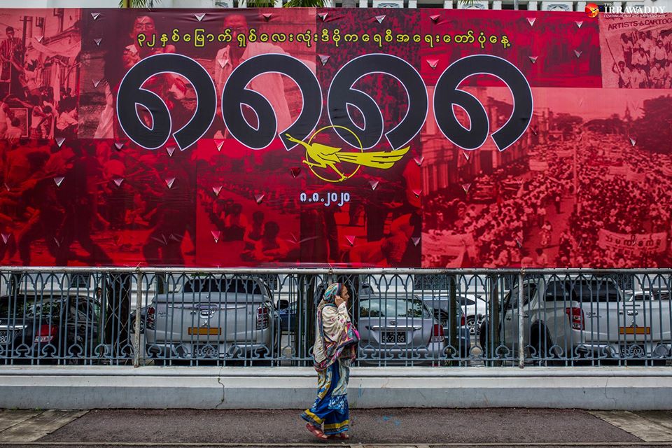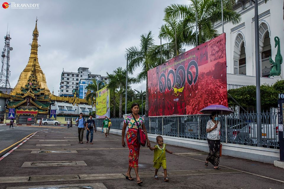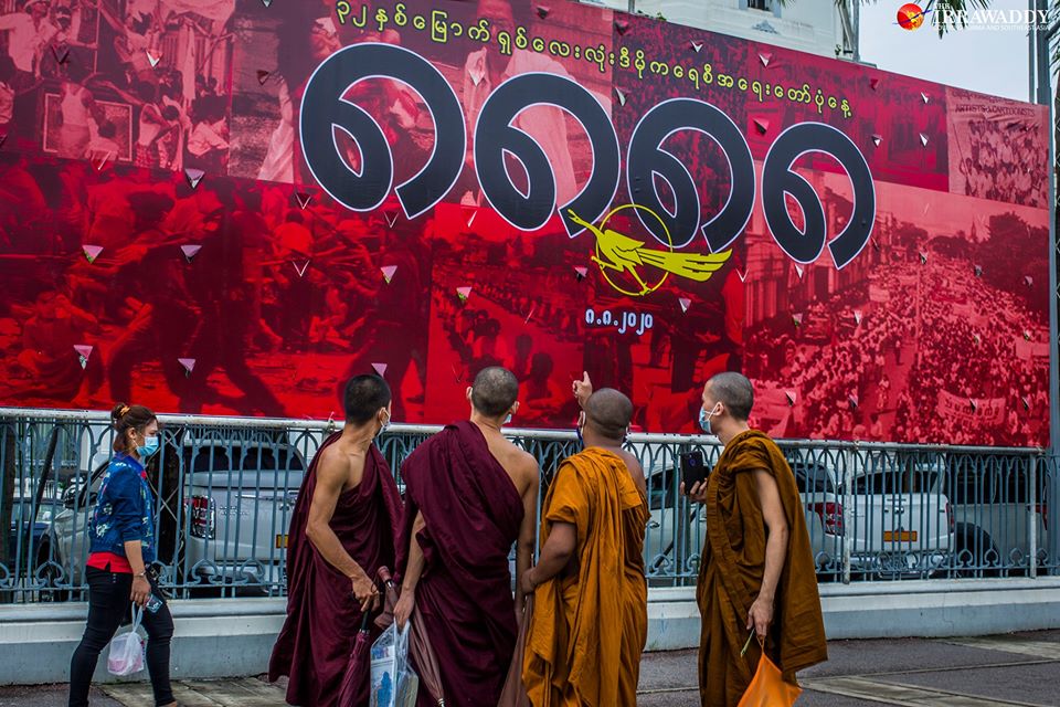 YANGON – Posters commemorating the ’88 Popular Uprising are erected in downtown Yangon on Wednesday ahead of the event’s 32nd anniversary on Saturday. Also known as the “Four Eights Uprising” in reference to the mass protests on Aug. 8, 1988, the nationwide democracy movement—the largest popular upheaval in modern Myanmar history—toppled the then military-backed Socialist government.