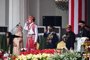 President Joko “Jokowi” Widodo wears a traditional outfit from Timor Tengah Selatan regency in East Nusa Tenggara during an Independence Day celebration on Aug. 17. (Biro Setpres/Agus Suparto)