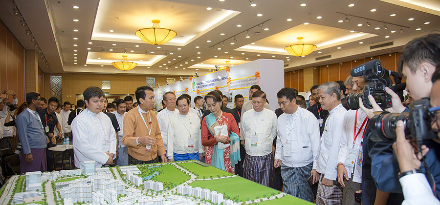 Myanmar State Counselor Daw Aung San Suu Kyi looks at a model of a Chinese-backed project at the Myanmar First Investment Forum in Naypyitaw in 2019. / Invest Myanmar Summit